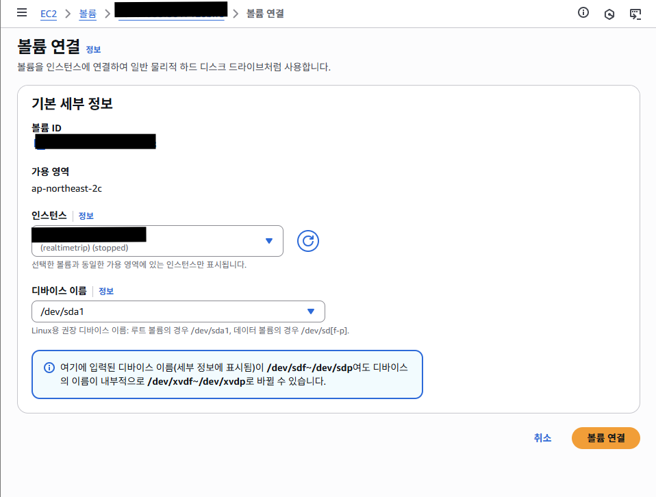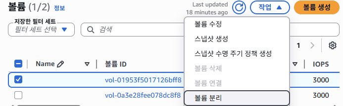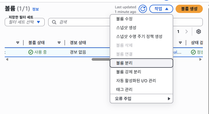 - EC2 콘솔 > EBS > 해당 인스턴스의 루트 볼륨을 분리했습니다. (중지 상태여야 분리 가능)