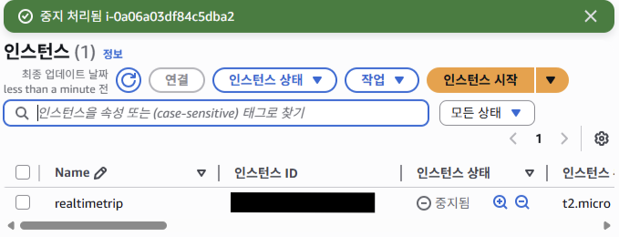 - 기존 인스턴스에 SSH 접속이 불가능한 상황이므로 먼저 EC2 인스턴스를 중지했습니다.