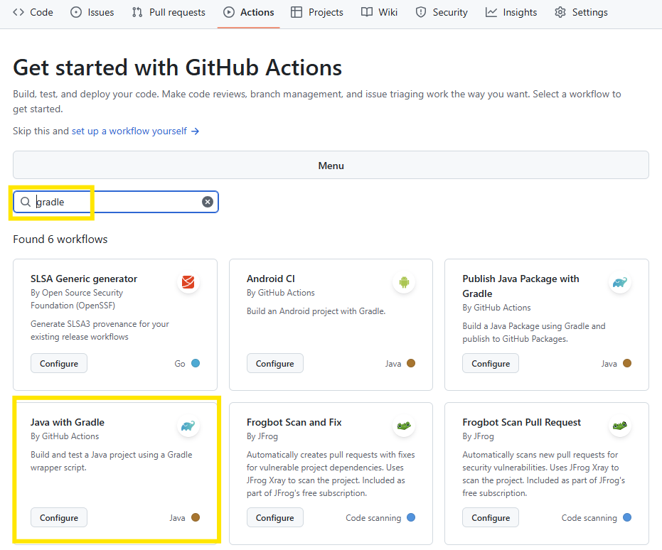 이제 GitHub Actions 워크플로우 파일을 생성합니다. GitHub Repository에 진입 후 Actions를 클릭합니다. gradle를 검색하고 Configure를 클릭하여 파일을 생성하면 됩니다.